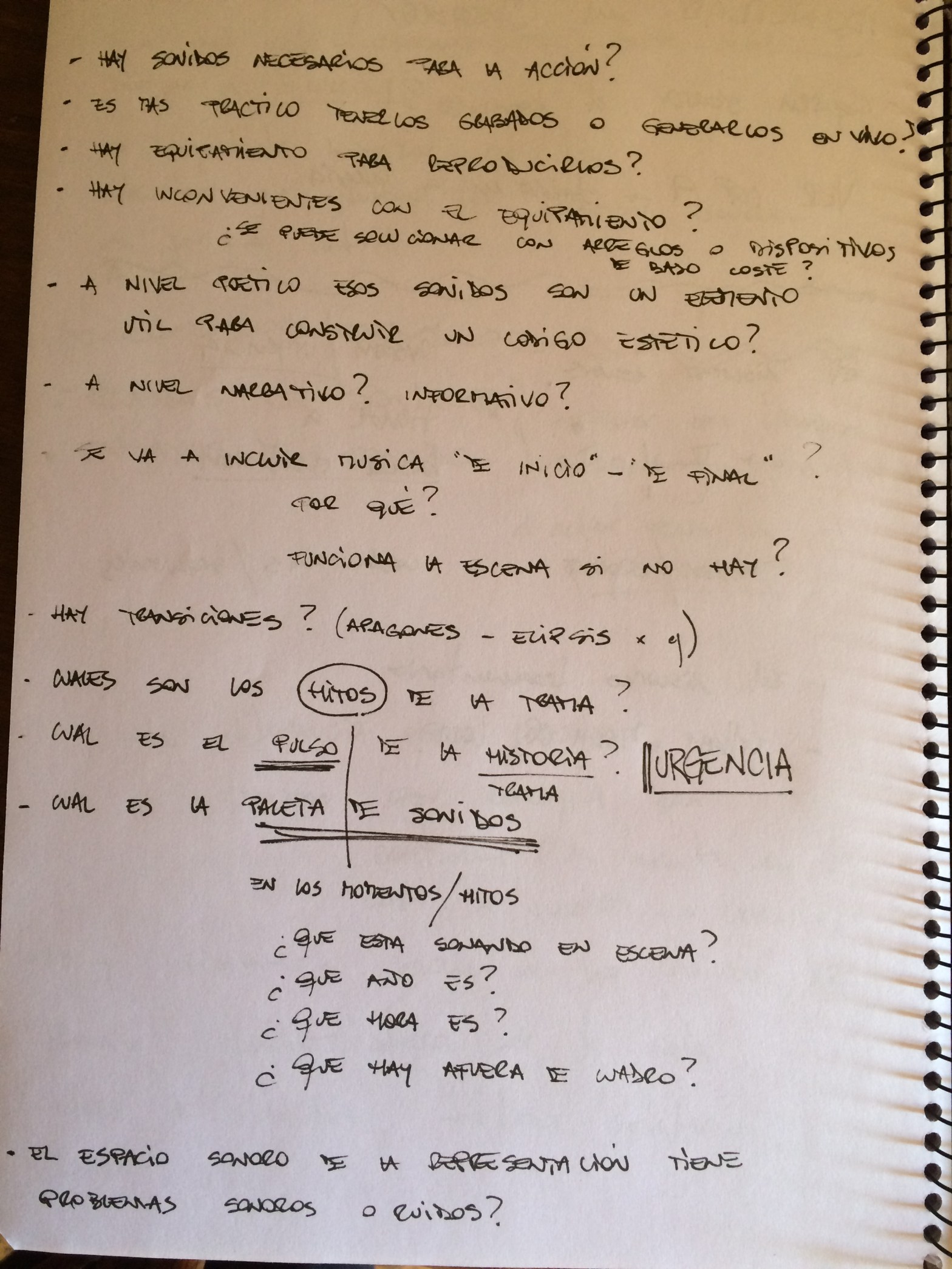 Para encarar un proceso fluido, sin bloqueos ni divagues, propongo una herramienta sencilla: una lista de preguntas. De sus respuestas surgirán muchos datos importantes para organizar ideas y comenzar a diseñar el planteo sonoro de una propuesta escénica.