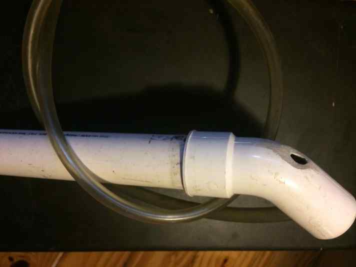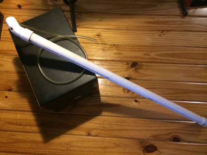 La fotografías y el audio pertenecen a un dispositivo construido con tubos de PVC, una manguera y una boquilla de madera inspirado en una flauta checoslovaca que se conoce como fujara.