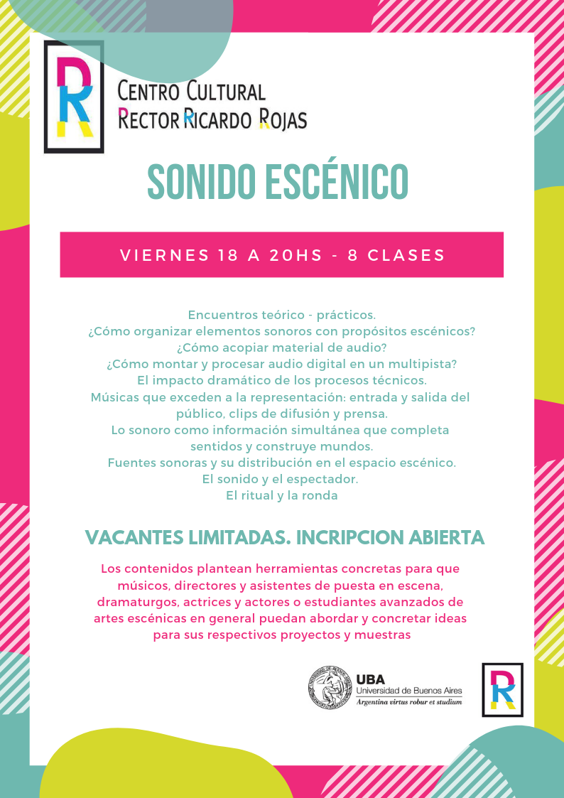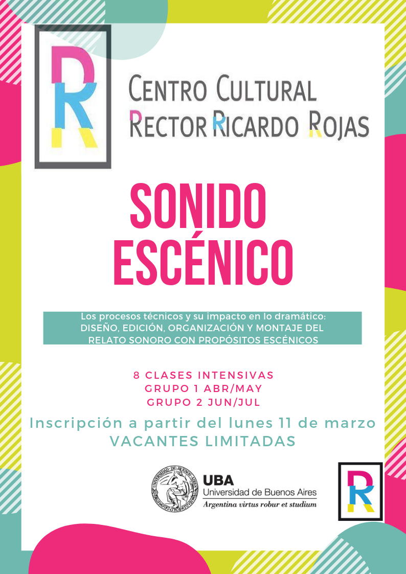 En 2019 Sonido Escénico es parte de la grilla de cursos del Area de Arte y Tecnología del Centro Cultural Rector Ricardo Rojas, UBA. Av Corrientes 2038 – Tel: 5285-4800.