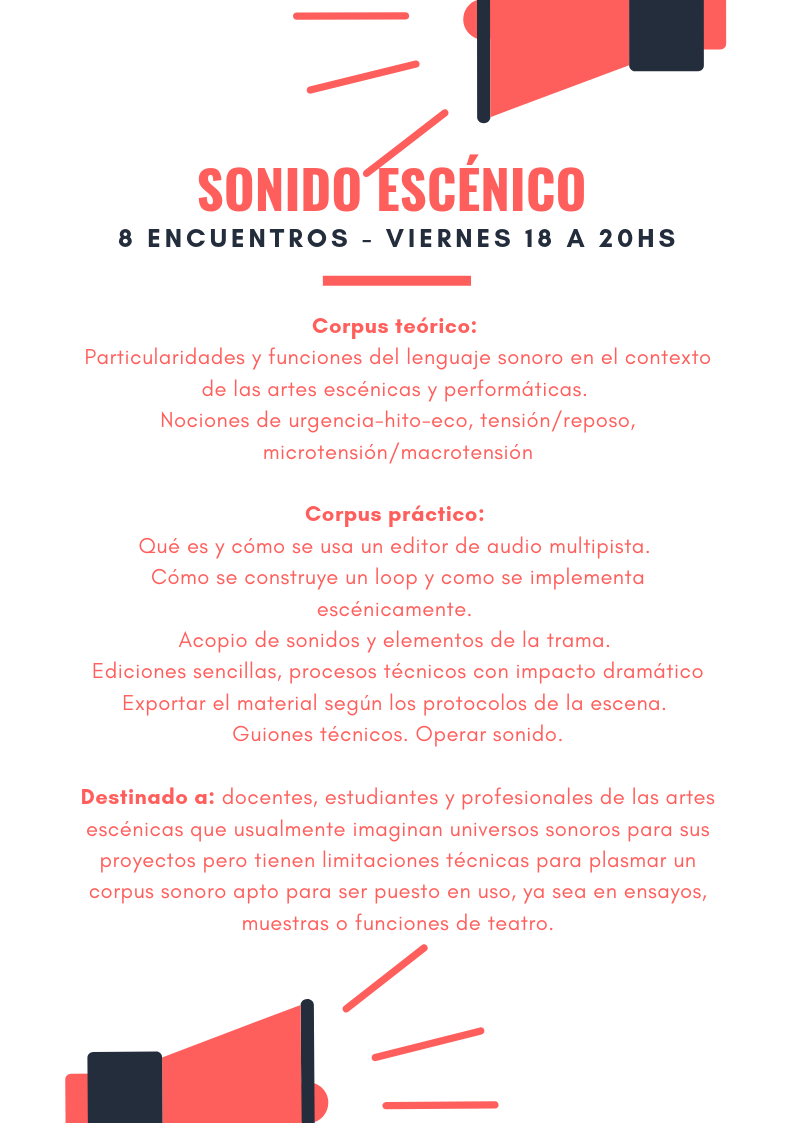 Un curso que te propone algo atípico en el mundo actual: un proceso creativo de 4 meses. A partir de textos breves vamos a construir propuestas sonoras mixtas (sonido acústico, amplificado y audio digital) con propóstios escénicos o performáticos. El objetivo es lograr un corpus sonoro que se ajuste a las necesidades estéticas, técnicas y prácticas de un montaje escénico, performático, callejero y un poquito audiovisual.