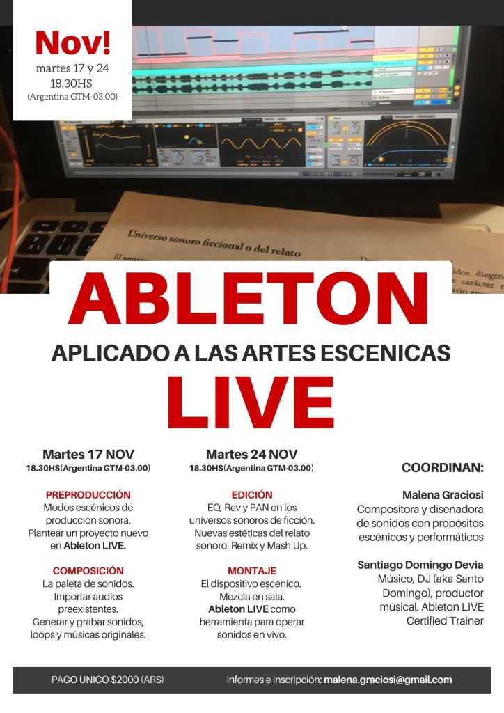 Taller intensivo de 2 encuentros para analizar cuatro etapas fundamentales de la producción sonora y musical con propósitos escénicos o performáticosCada tema será mostrado paso a paso en Ableton LIVE, un DAW que nos permite resolver cada una de las etapas de la tarea sin necesidad de recurrir a otros softwares.Los contenidos observan las necesidades específicas del circuito y sus códigos sonoros particulares: músicas originales, clips de difusión, transiciones técnicas, efectos, loops, producción de músicas originales, desde un enfoque netamente práctico, aplicado y explicado paso a paso con la compañía y seguimiento de Santo Domingo Devia Ableton Certified Trainer